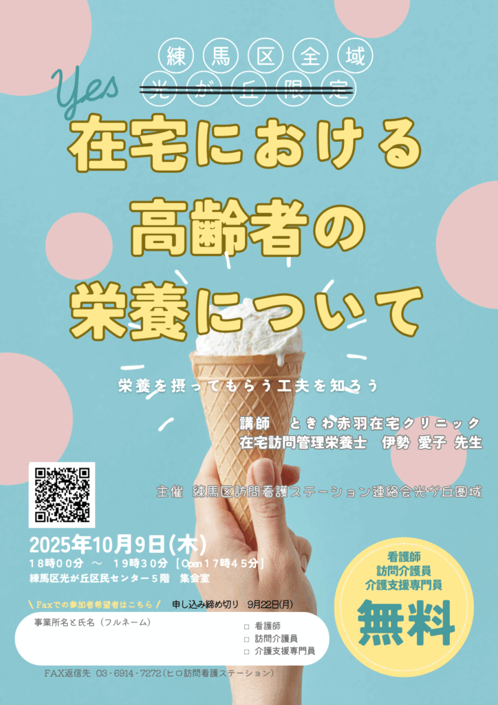 【🧁 在宅における高齢者の栄養について】 ― 栄養を摂ってもらう工夫を知ろう ― 在宅療養中の高齢者の「食べる力」や「栄養のとり方」について、実際の支援現場で活かせる工夫を学ぶ研修会を開催します。講師は、ときわ赤羽在宅クリニックの在宅訪...